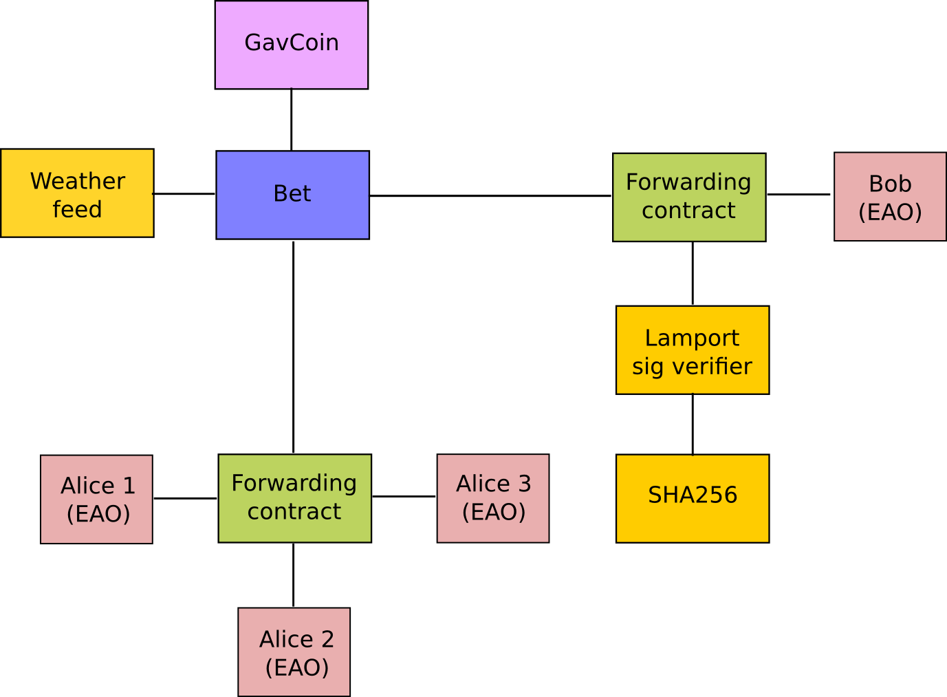Because contracts can play such different roles, we expect that contracts will be interacting with each other. As an example, consider a situation where Alice and Bob are betting 100 GavCoin that the temperature in San Francisco will not exceed 35ºC at any point in the next year. However, Alice is very security-conscious, and as her primary account uses a forwarding contract which only sends messages with the approval of two out of three private keys. Bob is paranoid about quantum cryptography, so he uses a forwarding contract which passes along only messages that have been signed with Lamport signatures alongside traditional ECDSA (but because he's old fashioned, he prefers to use a version of Lamport sigs based on SHA256, which is not supported in Lattice directly).